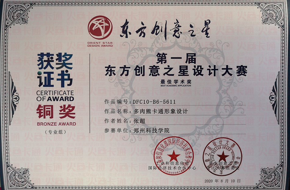 据了解,第一届东方创意之星设计大赛于2019年10月15日启动,至2020年6月29日截稿,共有1155家单位,16407人参赛,共征集作品19843件。全国33个省、自治区、直辖市、特别行政区,以及英国、意大利、澳大利亚、马来西亚、韩国等地均有作品参赛。本次大赛由工业和信息化部国际经济技术合作中心为指导单位,纺织服装产业互联网研究院、蚌埠市经济和信息化局共同主办。第一届东方创意之星设计大赛经专家评审,共评出获奖作品3751件,包括金、银、铜奖175件,最佳学术奖645件,优秀奖1105件,入围奖1826件,优秀组织单位奖119家及优秀指导教师奖30位。火鱼卡通创意总监张超老师作品在本次设计大赛中获得了最佳学术奖铜奖。